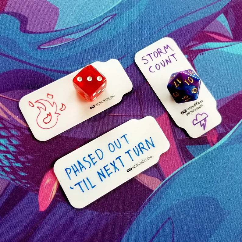 InfiniTokens Dry Erase Tags are customizable, reusable dry/wet erase long labels that can be used for card games such as Magic: The Gathering and for role playing games like Dungeons & Dragons.